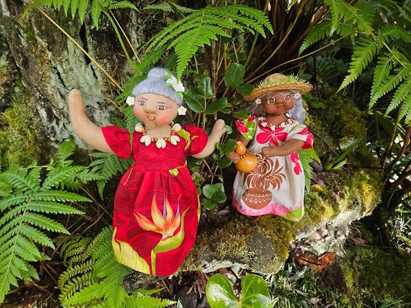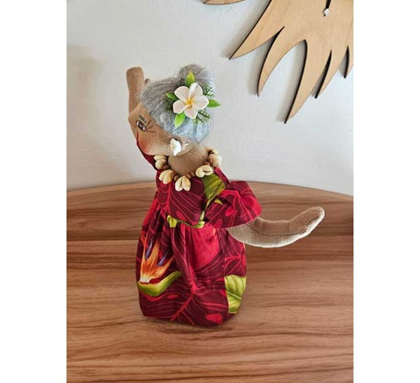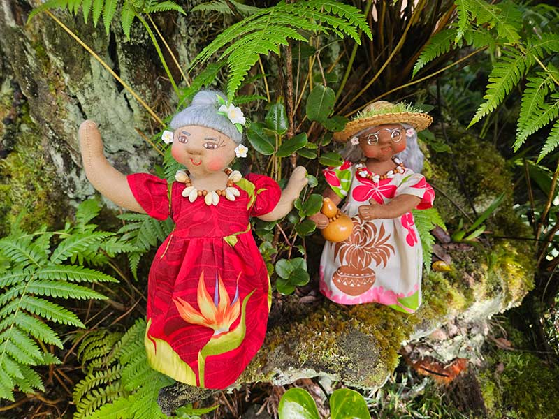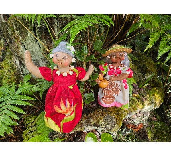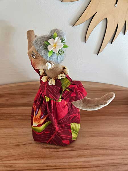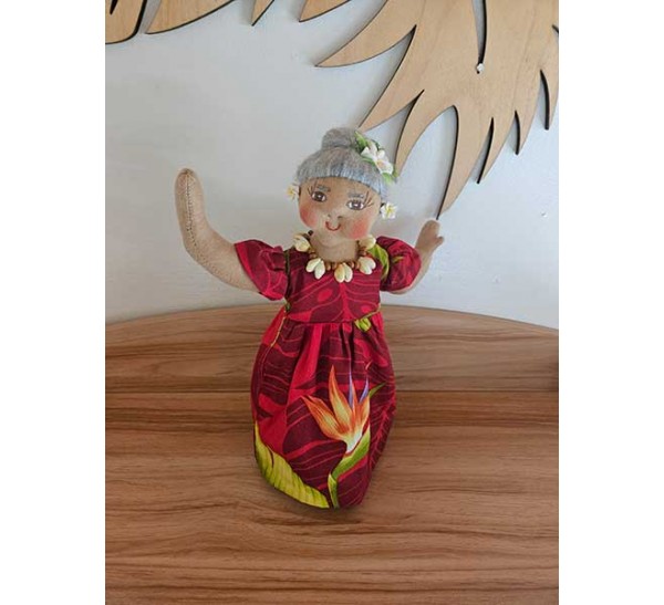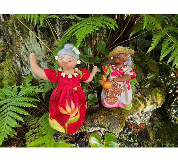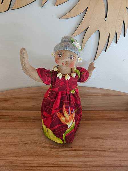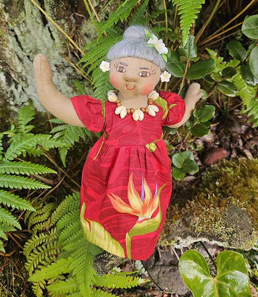 Kaili wears a red Muumuu with a Bird of Paradise design and red crocheted shoes. Her white and grey streaked hair bun is adorned with a Plumeria flower, fern and leaf hairpiece. Kaili wears a Kukui nut and Leho (cowrie) shell lei around her neck. Kukui represents inner light and spirit revealing itself. Leho shells invoke the protection of the spirits in connection with the strength and the power of the ocean. Kaili is a 10” tall cloth doll who was individually handcrafted on the Big Island of Hawaii with the greatest love and respect for all that is Hawaii. Her body is made out of doll skin and stuffed with high quality poly fill. The body is wired for flexibility. The eyes and mouth are intricately embroidered onto the face. All accessories were individually hand crafted. Kaili is not a dress up doll. All clothing and accessories are sewn and/or glued onto her. |