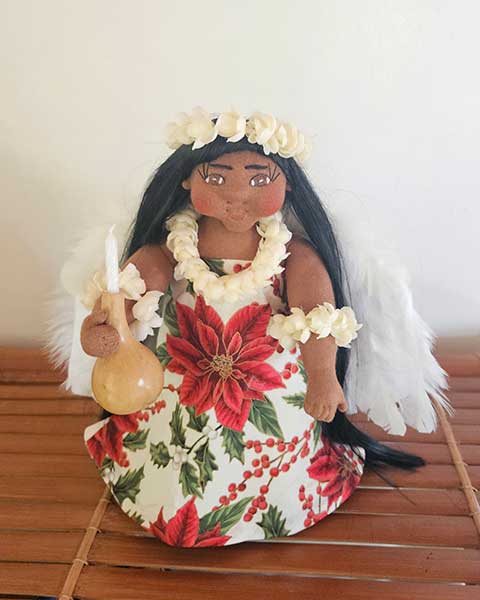 She is devoted to protecting and guiding you on your life’s journey. Pua Kalikimaka means Christmas Flower in the Hawaiian language. Pua Kalikimaka moves in harmony with the Mana (spiritual energy) of the Universe. Her clearness of vision empowers, enchants and manifests energy. The sacred rhythm of the Ipu (gourd) echoes across the ‘Aina (land) calling Pua Kalikimaka, the Angel of Christmas to earth. Pua Kalikimaka’s home is Lanikeha, the high sky. Pua Kalikimaka carries a candle in her sacred Ipu, which invokes blessings of the divine. The heavenly light of Pua Kalikimaka’s candle illuminates the paths of the Menehune’s lives on earth. The Menehunes know Pua Kalikimaka always watches over them enlightening their lives with her angelic presence. Hearing the divine drumming of the Ipu in the distance, the Menehunes sense that Pua Kalikimaka is near. Sometimes she allows them a glance at the heavenly glow of her candle or a glimpse of her angelic white feather wings passing by to remind them how brightly the Aloha spirit is shining from their own souls. |