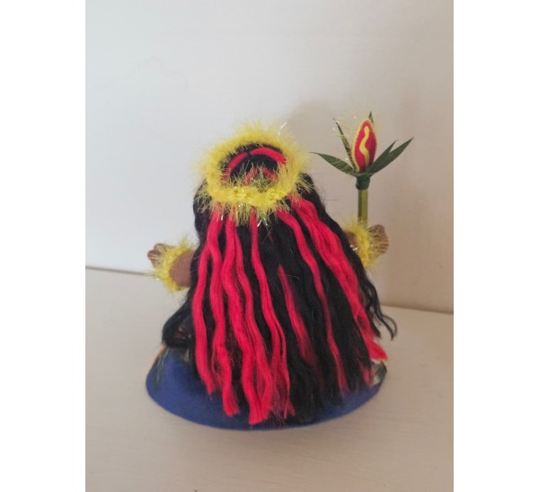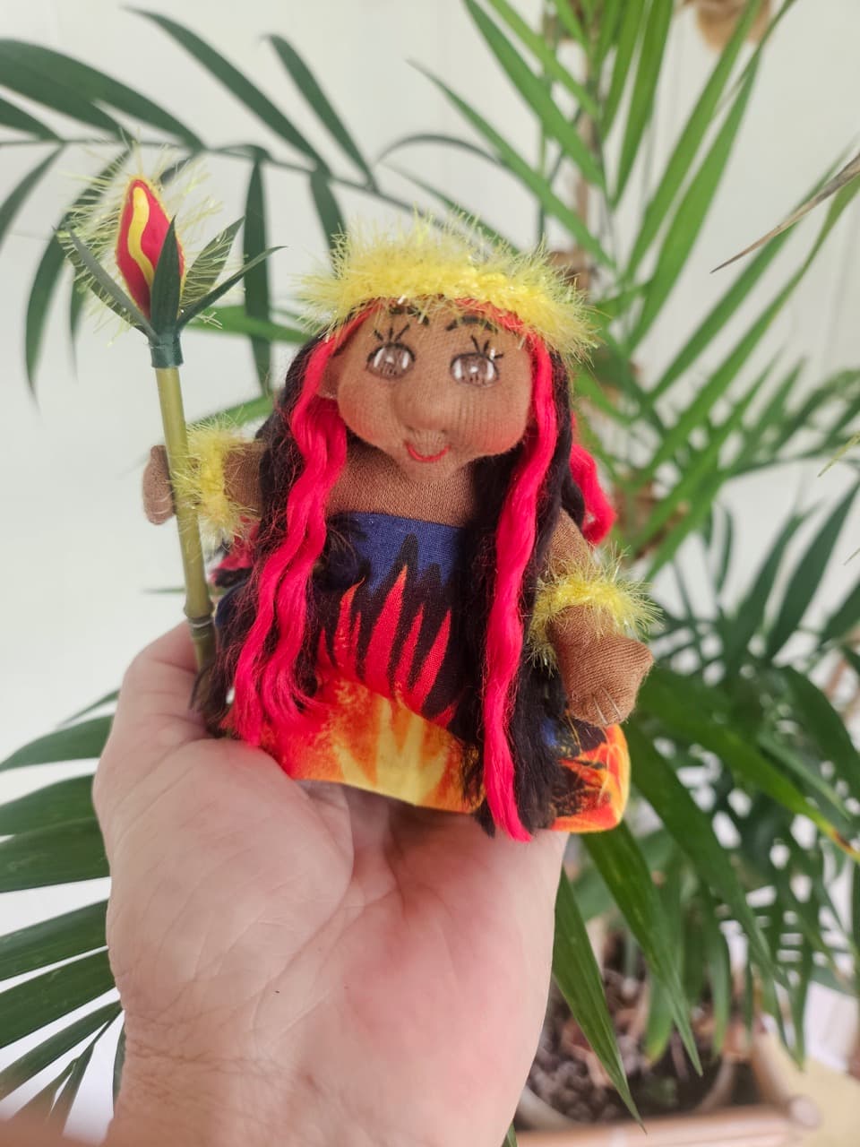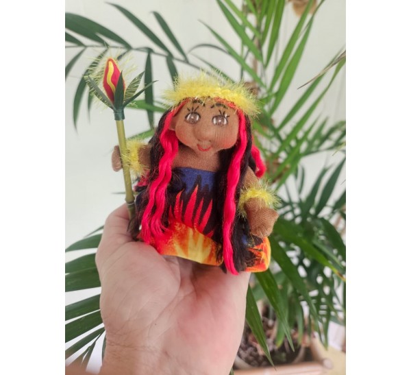 Pele is about 4” tall fitting in the palm of your hand. The body is made out of doll skin and wired for flexibility. The eyes and mouth are intricately embroidered onto the face. Pele has tiny little hands and feet, ears, buttocks, and a belly button. All accessories were individually handcrafted. Pele is not a dress up doll. All clothing and accessories are sewn and/or glued onto her. Doll care: Gently brush the dolls and their clothing with a soft dry toothbrush to remove dust. Always brush the faces and bodies upwards towards the hair. Do not brush the hair!